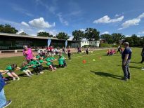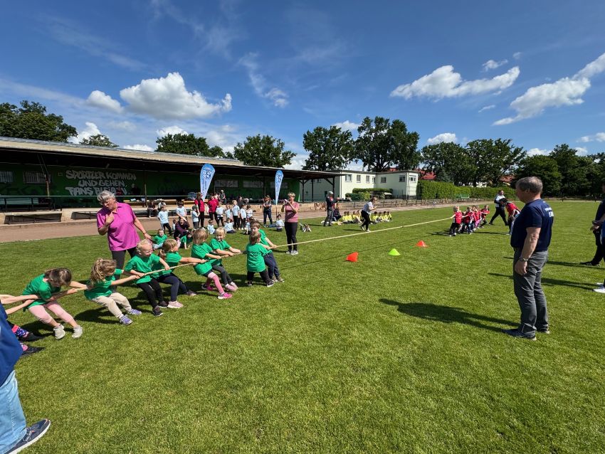Am 27.05. fand, hier im Stadion am Eichenhain, unser Kindergartensportfest, bei schönem Wetter , statt. 51 kleine Knirpse aus den Kindergärten Sonnenland und Zwergenhaus aus Gröditz, Wirbelwind Nauwalde und erstmalig Streumen, was uns sehr gefreut hat, nahmen daran teil und ermittelten die besten kleinen Sprinter, Werfer und Springer aus ihren Reihen. Leider fehlten dieses Jahr einige Kindergärten, was sehr schade war. Die Eröffnungsrede übernahm natürlich unser Bürgermeister Enrico Münch. Mit großer Begeisterung wurden die sportlichen Aufgaben angegangen und erfolgreich absolviert. Natürlich durfte auch die Hüpfburg und allerlei Spielzeug nicht fehlen. Als die Einzeldisziplinen erledigt waren kam es zu einem Rundenlauf, mit einer kleinen Überraschung für jeden Sportler am Ende und dem Tauziehen der Kindergärten. Danach wurde die mit Spannung erwartete Siegerehrung auf dem Siegerpodest durchgeführt und Gold, Silber, Bronze, sowie die Urkunden wurden an die besten jungen Sportler verteilt. Selbstverständlich bekam jeder eine Teilnahmemedaille. Den Pokal für die beste Mannschaft konnte der Kindergarten Sonnenland gewinnen, was natürlich sehr bejubelt wurde. Es war eine tolle Veranstaltung und wir danken allen fleißigen Helfern und dem KSB Meißen für ihre tatkräftige Unterstützung und freuen uns schon auf das nächste Jahr, wenn es wieder heißt "Schneller, Höher, Weiter" beim Kindergartensportfest.