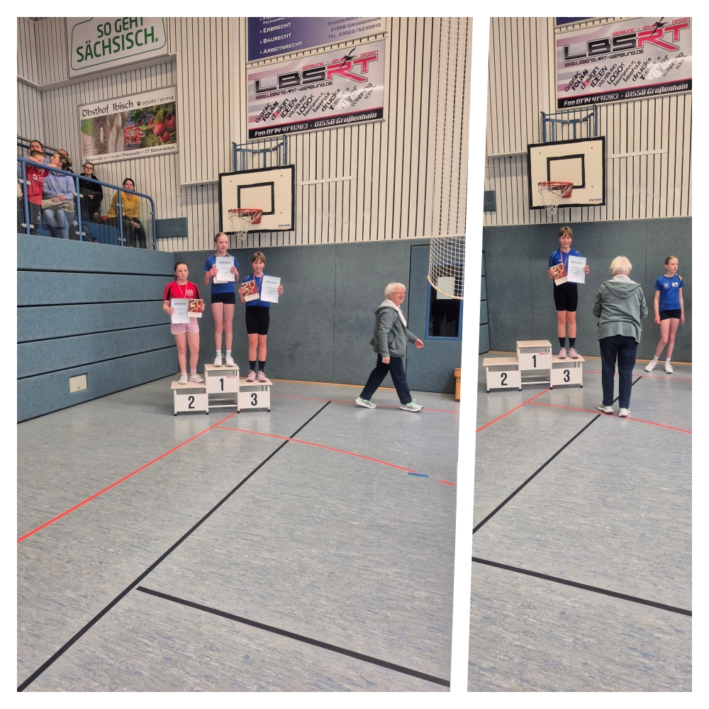 Die Mädchen der AK 9 ergatterten ebenfalls ihre Plätze auf dem Podest. Im Dreierhopp sicherte sich Sophia Cielanga mit einer Weite von 5,05 m den Kreismeistertitel. Auch im 30 m-Sprintfinale behielt sie die Nerven und wurde mit einer Zeit von 5,41 s Zweite. Emma Bölke übertrumpfte im Medizinballstoßen alle anderen. Der Preis – eine Goldmedaille für 5,59 m. Juliane Gröger, die ebenfalls in dieser AK startete, freute sich über zwei Bronzemedaillen. Sie stieß den Medizinball 5,25 m und zeigte auch im Dreierhopp mit 4,86 m, dass der 3. Platz verdient ist.